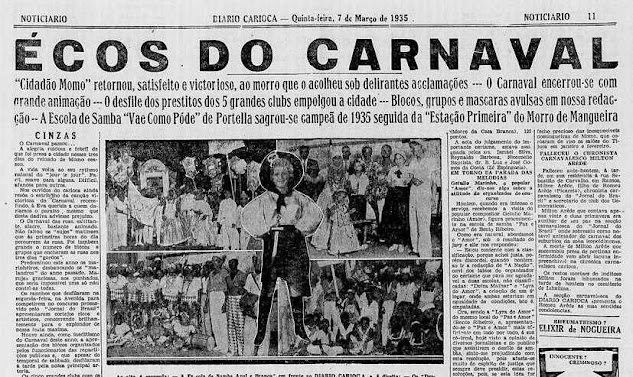 | Jornal Diário Carioca, de 7 de março de 1935, noticiando a vitória da Vai como Pode. Imagem: Reprodução/PortelaWeb |