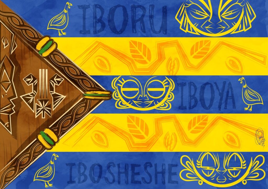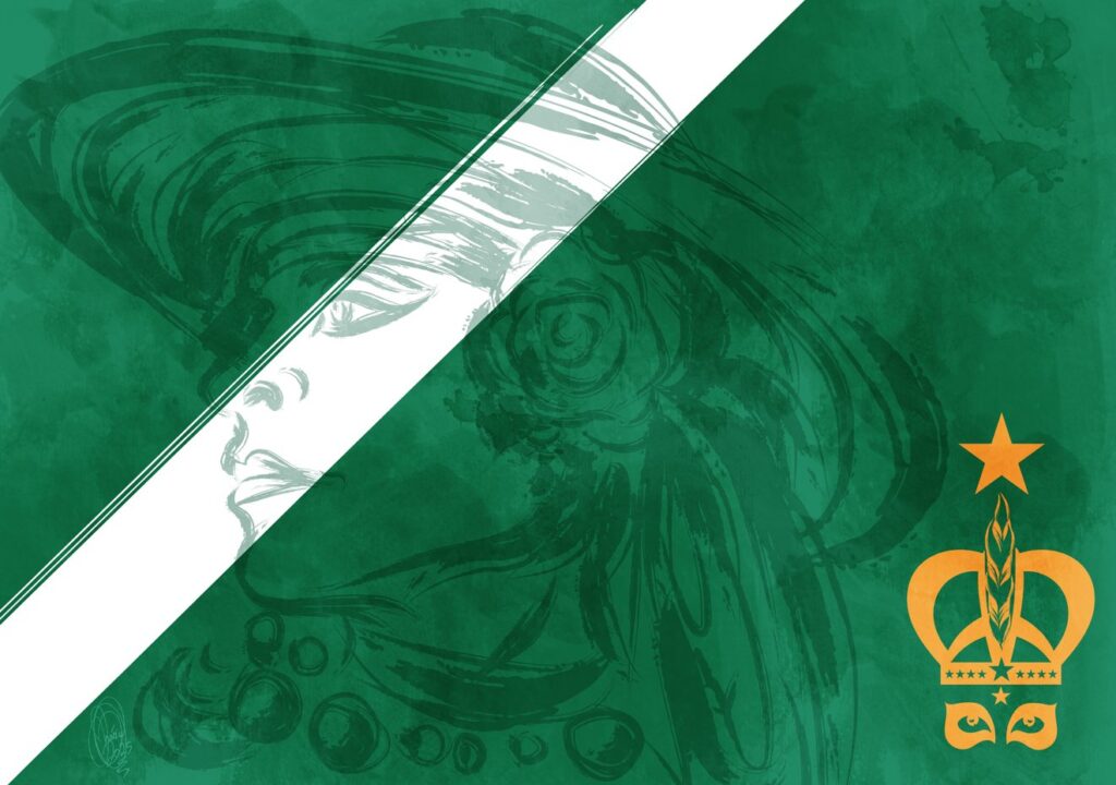 “Iboru, Iboya e Ibosheshe representam as três mulheres que surgiram para Orunmilá, figura central nas tradições de matriz africana. A presença dessas mulheres é fundamental para compor a narrativa visual da bandeira, trazendo consigo a força e a ancestralidade femininas. A bandeira, inspirada em Cuba, é ilustrada nas cores da escola, ressaltando a identidade e o pertencimento. O tabuleiro de Ifá é incorporado à composição, simbolizando o conhecimento, o destino e a conexão com o sagrado. A integração desses elementos reforça a ligação entre tradição, espiritualidade e cultura.”