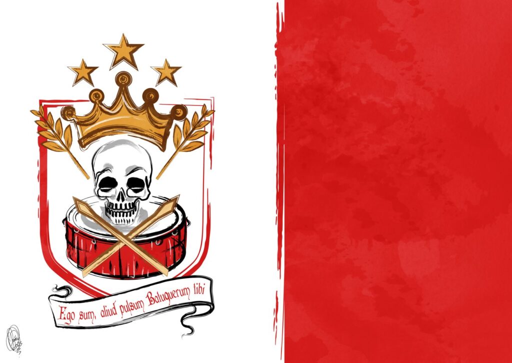 “Na criação da bandeira dedicada a Ciça, conhecido como Caveira, foram utilizados elementos que remetem diretamente à sua trajetória. A base da composição é inspirada na bandeira de Niterói, cidade onde fica a escola. A caixa, instrumento que representa a força do ritmo e da cadência do samba, também possui os símbolos e estrelas da Viradouro. Na bandeira, um destaque especial é dado à frase em latim: ‘eu sou mais um batuqueiro a pular por você’ (ou expressão semelhante). Essa mensagem sintetiza o espírito de entrega e paixão do ritmista e seu respeito e admiração pelo mestre Ciça.”