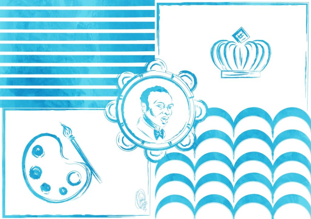 “Para a elaboração da bandeira, busquei inspiração em algumas das obras mais reconhecidas de Heitor do Prazeres, especialmente aquelas que retratam guarda-chuvas e o chão da roda de samba. Esses elementos, recorrentes na produção do artista, foram fundamentais para nortear a composição visual, pois representam de forma singular a atmosfera das rodas de samba e a vivacidade das manifestações culturais populares brasileiras. Além disso, o símbolo da escola foi integrado à bandeira, criando uma fusão entre a identidade visual da agremiação e o legado artístico de Heitor do Prazeres. Essa combinação reforça o diálogo entre tradição e criatividade, resultando em uma obra que valoriza tanto a história do samba quanto a expressão visual da escola.”