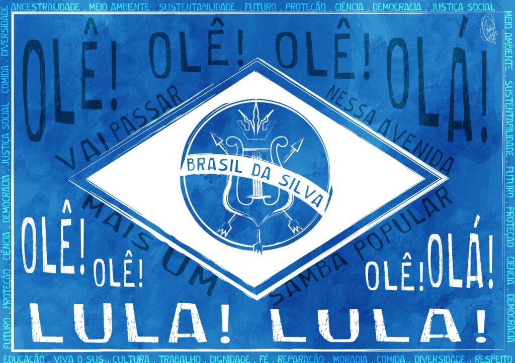 “A bandeira criada para o enredo de Niterói foi inspirada no conceito de ‘O Brasil da Silva’, estabelecendo um direcionamento claro para seu desenvolvimento visual. Essa proposta busca representar de forma simbólica e artística os elementos que compõem a identidade nacional, refletidos na trajetória do personagem central. Ao redor da bandeira, foram incorporadas referências às causas pelas quais Lula tem lutado durante toda a sua vida. Esses símbolos e elementos visuais compõem um mosaico de lutas sociais, culturais e políticas que marcaram sua história e contribuíram para a construção de sua imagem pública. Outro aspecto fundamental na composição da bandeira é o refrão do samba, que rapidamente conquistou a preferência popular. Essa escolha reforça o elo entre o enredo, o personagem e o povo, tornando a obra ainda mais significativa dentro do contexto carnavalesco e cultural do Brasil.”