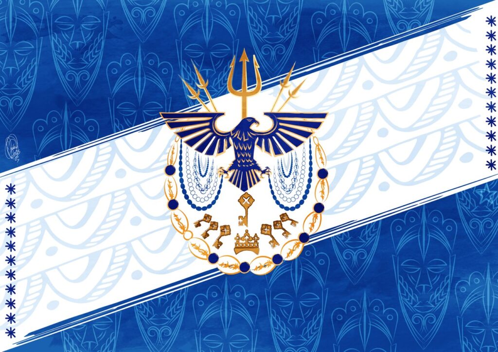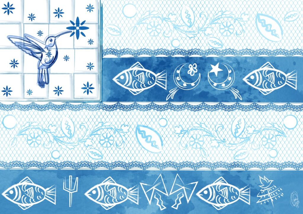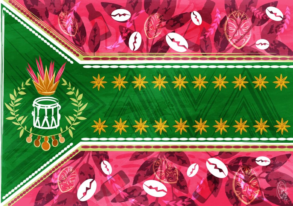 “A bandeira da Bahia, estado onde acontece o tradicional Bembé, serve como base para a construção visual. Sua presença remete à força cultural e religiosa da região, sendo um símbolo de resistência, celebração e ancestralidade. A composição traz Oxum, Xangô, Exú e Iemanjá. Elementos como rendas, que remetem à tradição do vestuário afro-brasileiro, e búzios, que simbolizam a comunicação com o sagrado. Outro destaque visual é o beija-flor ilustrado em azulejo português, encontrado em algumas casas antigas de candomblé na Bahia. Essa referência agrega valor estético à bandeira, evocando o sincretismo religioso e o legado histórico presente na arquitetura e na arte popular baiana. Ilustrar essa bandeira me exigiu uma profunda espiritualidade.”