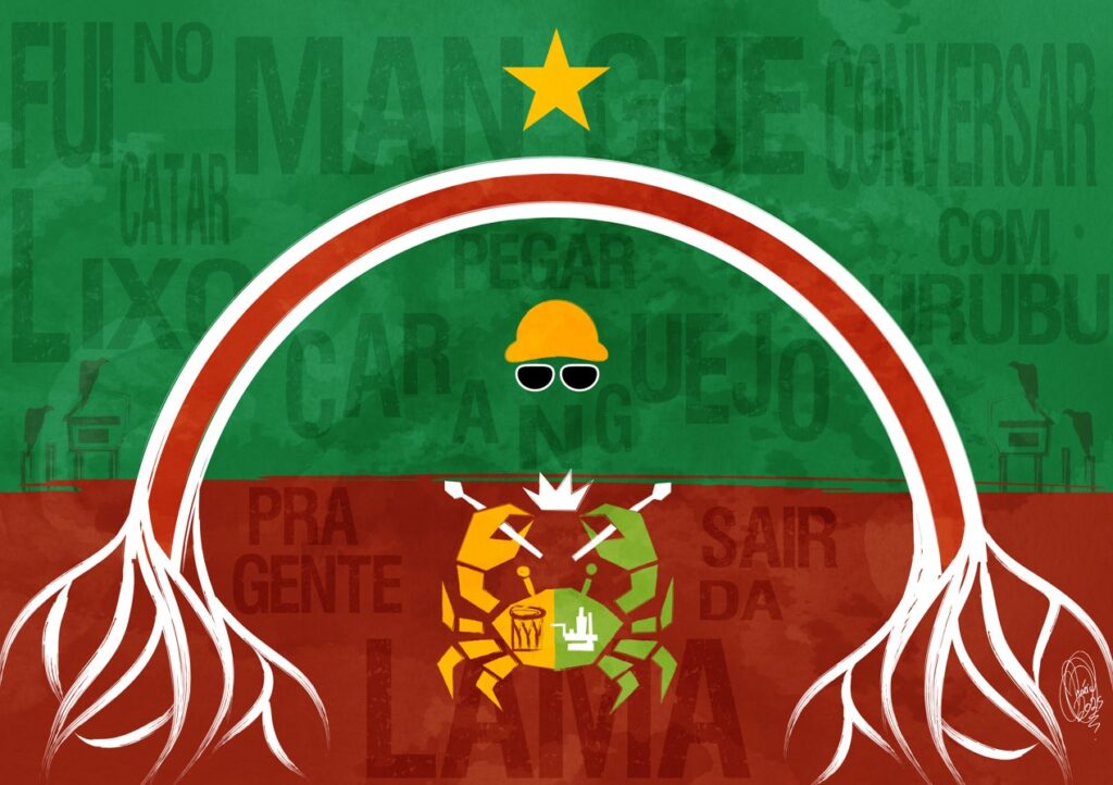 “Na elaboração da bandeira dedicada a Chico Science, foram incorporados diversos elementos que representam tanto a identidade do artista quanto o movimento cultural MangueBeat. As letras das músicas de Chico, marcantes por sua poesia e crítica social, aparecem como destaque na composição, reafirmando a relevância de sua obra para a cultura brasileira. O chapéu e os óculos, acessórios característicos dele, também estão presentes na bandeira. Eles funcionam como símbolos visuais que remetem imediatamente à sua figura. Outro elemento central da bandeira é o caranguejo, ícone do MangueBeat, o brasão da escola e a estrela de seu único campeonato até o momento.”