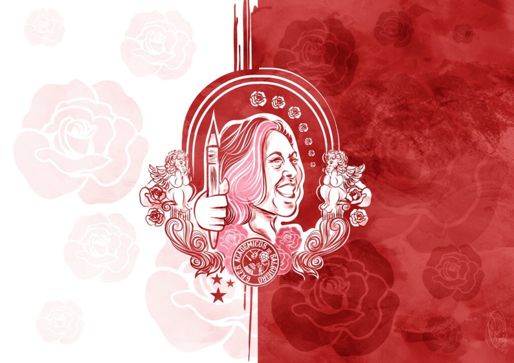 “Rosa Magalhães, além de lendária carnavalesca, é reconhecida como uma das mais importantes professoras da Escola de Belas Artes do Rio de Janeiro. Sua trajetória acadêmica e artística influenciou gerações de estudantes e profissionais do carnaval, consolidando seu nome como referência em criatividade e inovação no cenário artístico brasileiro. No contexto da representação visual, Rosa Magalhães assume um papel de destaque ao substituir Minerva, tradicional símbolo do brasão da Universidade Federal do Rio de Janeiro (UFRJ). Essa substituição simboliza não apenas o reconhecimento de sua relevância, mas também a valorização da cultura e da arte nacional, estabelecendo um elo entre a tradição acadêmica e o universo carnavalesco.”