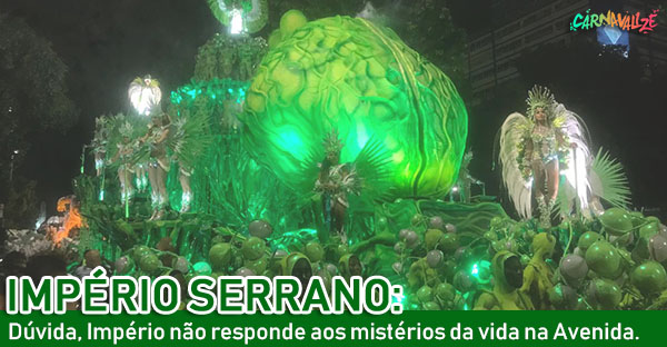 Depois de um rebaixamento – que não aconteceu graças à virada de mesa – no último carnaval, o Império Serrano foi o responsável por abrir a temporada de desfiles do Grupo Especial em 2019. Com um pré-carnaval conturbado financeiramente, a escola optou por um enredo autoral do carnavalesco Paulo Menezes sobre a vida, de título “O que é? O que é?”, inspirado na música de Gonzaguinha, que foi escolhida como a letra oficial da Serrinha para este ano.