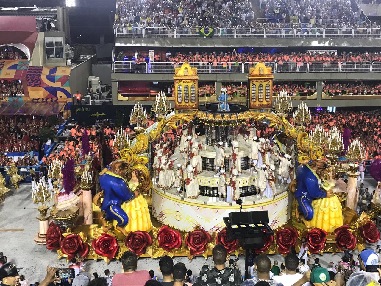 | Apesar do problema hidráulico, o carro da Viradouro que encenou A Bela e a Fera arrancou suspiros das arquibancadas. |