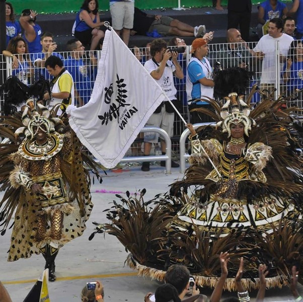 Há mais de vinte anos, Giovanna Justo ostenta um pavilhão carregado nas alturas por um mastro alto. Assim, é possível vê-lo girar livre e acima de todo o tapete de componentes da escola. Paulinha Penteado, em São Paulo, ostenta o belo pavilhão do Vai-Vai junto ao céu. Fotos: Wigder Frota e Levi Bianco