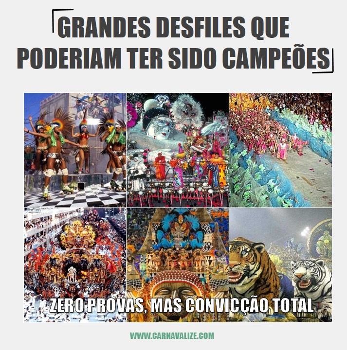 Como escolher apenas um campeão por ano com tantos desfiles maravilhosos? Escolher apenas uma entre várias escolas é das tarefas mais difíceis. Sem falar que julgamento é sempre uma coisa muito subjetiva e algumas injustiças já aconteceram durante a história. Não estamos aqui pra desmerecer os vencedores, mas apontar outros desfiles que poderiam tranquilamente ter levado o caneco. Provas não temos, apenas muita convicção.