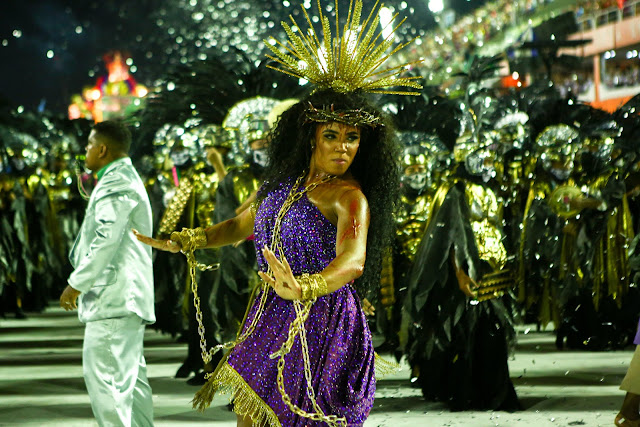 A Rainha de Bateria da Mangueira, Evelynn Bastos, com Mestre Wesley ao lado e ao fundo, a Tem Que Respeitar Meu Tamborim, no desfile de 2020. Foto: Gabriel Nascimento/Riotur