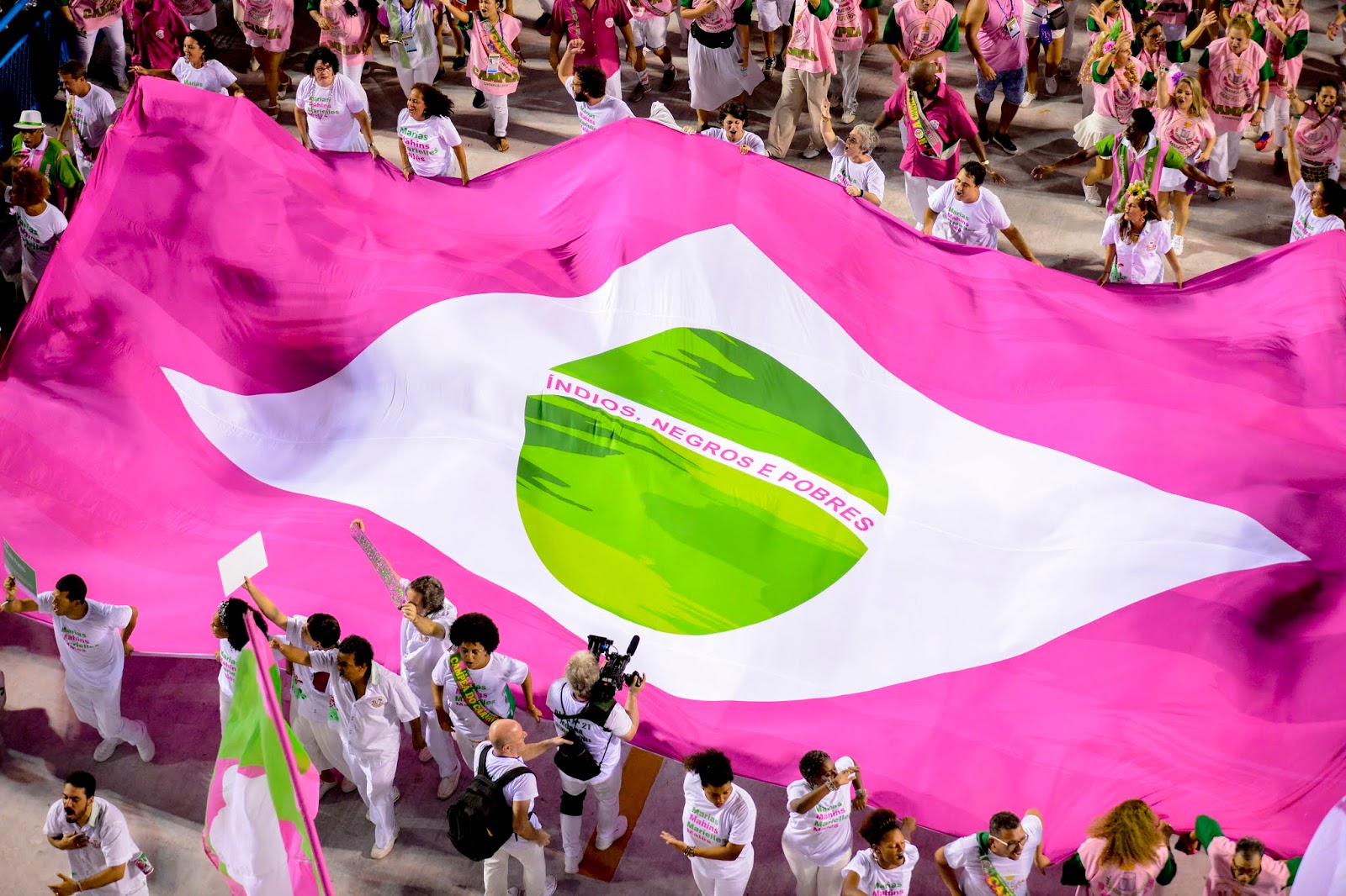 Diante de um momento em que a bandeira nacional é cooptada narrativamente por grupos definidos como “patriotas” e moralistas, símbolo de uma história oficial e sangrenta, o carnavalesco reimaginou nossa maior símbolo pátrio. Saiu o amarelo na clássica combinação e entrou o rosa mangueirense. O espaço da frase positivista “ordem e progresso” foi preenchido com uma homenagem a “negros, pobres e índios”. Símbolo de um Brasil possível, da voz dos excluídos, o enorme bandeirão foi desfraldado ao final do cortejo por políticos e figuras públicas da maior importância, ajudando essa imagem a se tornar símbolo do histórico campeonato mangueirense daquele ano. Repercutindo por todo mundo, pode-se afirmar que a criação se tornou uma das mais importantes expressões artísticas realizadas no último ano pelo Brasil inteiro e não só no carnaval.